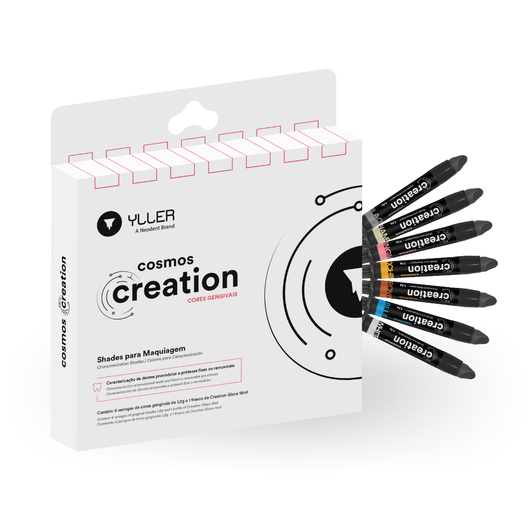– Seleccione el color deseado de Cosmos Creation y, con la ayuda de un pincel, aplique según sea necesario, sin exceder nunca las capas de 0,3 mm de grosor; – Fotopolimerización en una cámara UV con al menos 36W de potencia. Para cada aplicación, fotopolimerice durante al menos 1 minuto. Después de aplicar las capas de pigmentación, aplique una capa final de Cosmos Creation Glaze y fotopolimerice durante 3 minutos para garantizar una excelente dureza de la superficie.4. Precauciones, restricciones, advertencias.